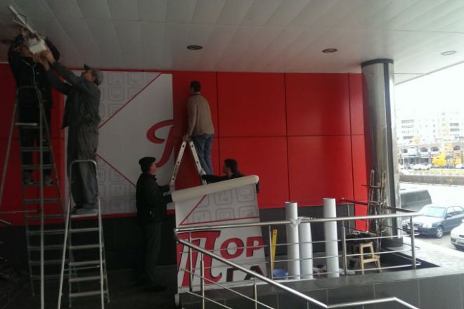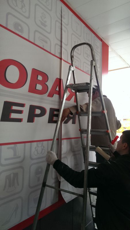 Как правило, большие вывески изготавливаются из баннерной ткани и монтируются при помощи конструкций или механического крепления к стене. Но время не стоит на месте, вывеска, показанная на фотографиях, сделана из уникального материала Asphalt Art®TexWalk®.